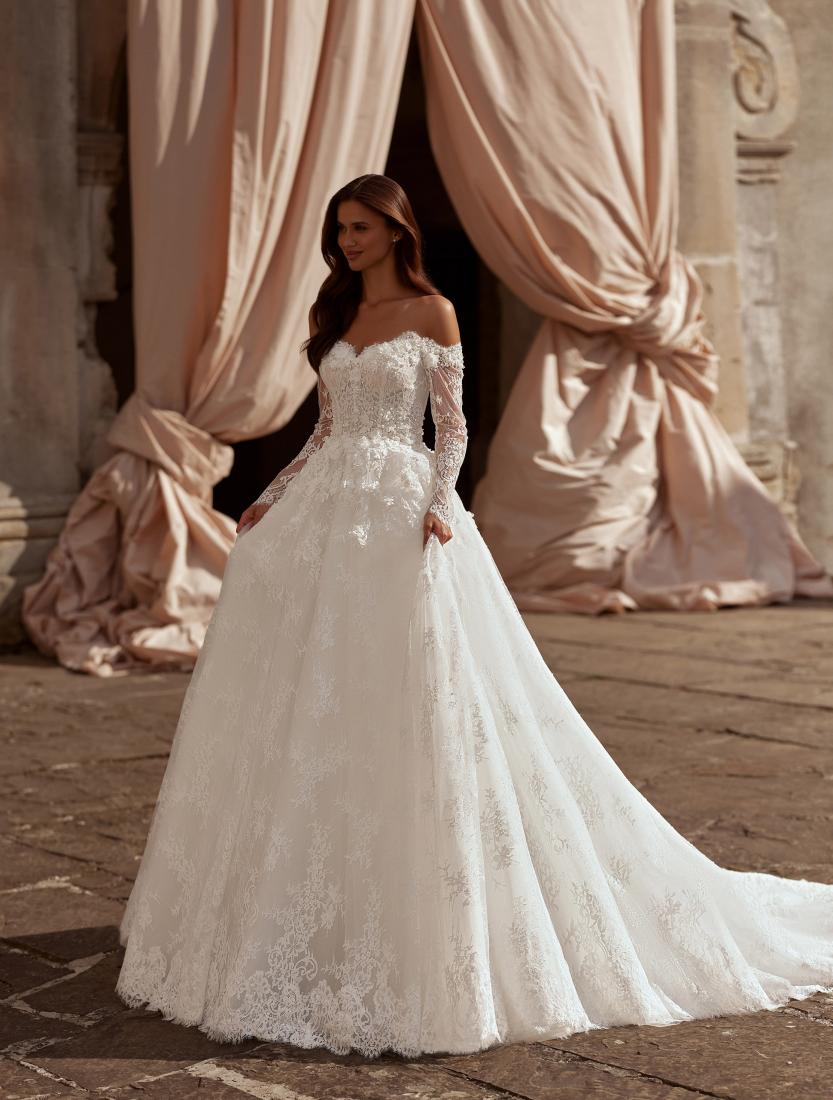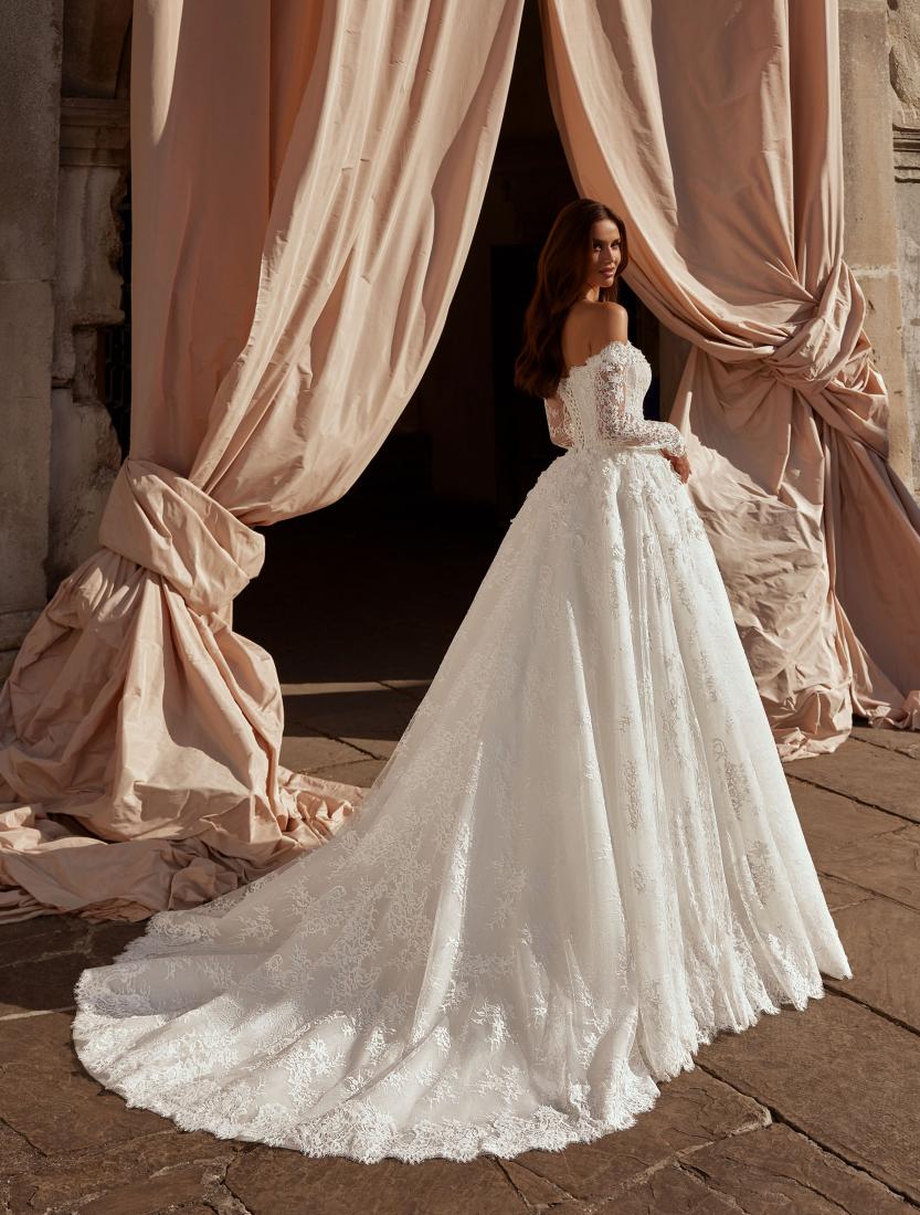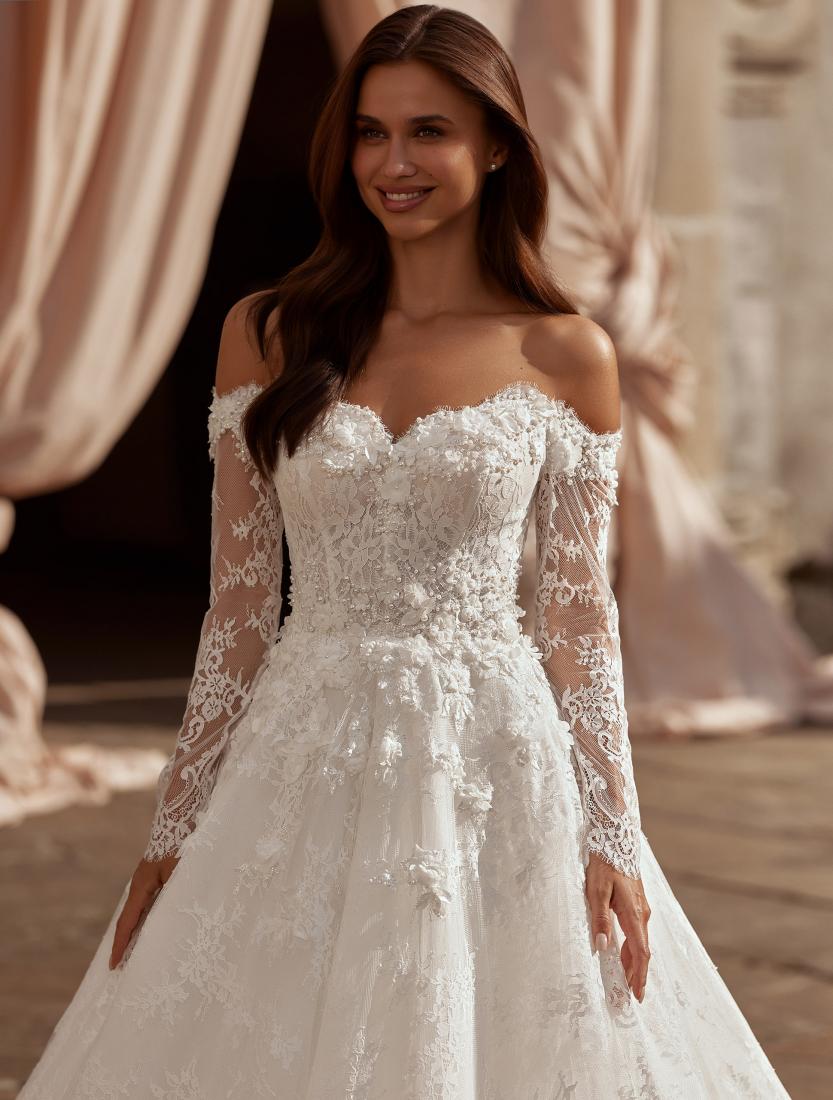 A stunning A-line wedding dress crafted from delicate lace with elegant long sleeves. The exquisite bodice is adorned with scattered tiny pearls and floral 3D lace appliqués, adding depth and softness to the look. The lace, shimmering with subtle glitter, creates a magical glow with every movement. The voluminous skirt with a fairytale train completes the luxurious ensemble, enhancing the airy and dreamy elegance of the bride.